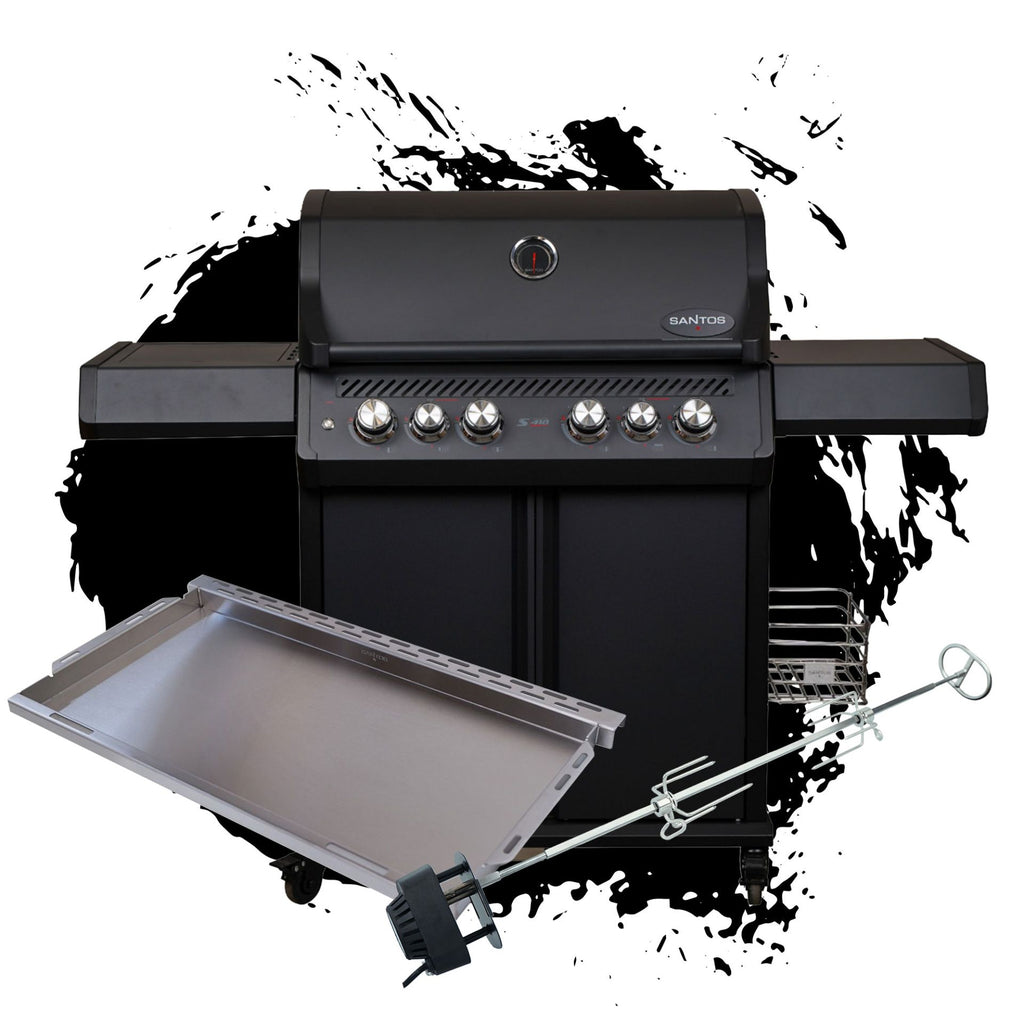 SANTOS S-418 Pro All Black Matt | Seiten- & Heckbrenner | inkl. Drehspieß + SANTOS XXL PLANCHA