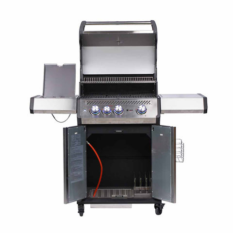 Die in den Farben Blau und Rot beleuchteten Bedienelemente setzen Euren S-301 Pro gekonnt in Szene und ermöglichen Euch auch in der Dämmerung und bei Dunkelheit eine präzise Steuerung der Grilltemperatur. Sie sehen nicht nur stylisch aus, sondern zeigen auch an, welcher Brenner gerade mit Gas versorgt wird. Blau bedeutet, dass bei dem entsprechenden Brenner kein Gasfluss vorhanden und der Brenner aus ist. Rot bedeutet, dass die Gaszufuhr geöffnet ist. Hinweis: Bei roter Beleuchtung solltet Ihr zusätzlich überprüfen, ob dieser Brenner auch gezündet ist.